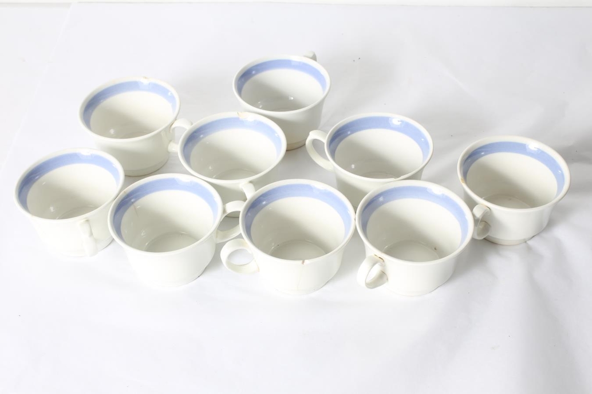 Tíu stykki hvítir bollar með blárri rönd efst að innanverðu, undirskálar vantar. Úr eigu Kvenfélags Valla og Skóga, notað á Atlavíkurskemmtunum er kvenfélagið seldi þar veitingar á útiskemmtunum á árum áður. Notað til að drekka úr. Arabia - made in Finland.
