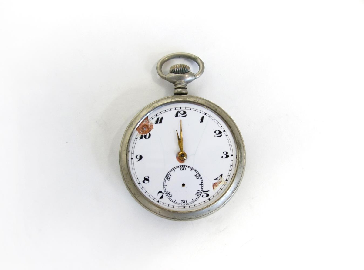 Vasaúr úr málmblöndu með hvítri skífu. Gler vantar. Úrið er ekki höfundarmerkt en innan á bakskífu eru krotuð ýmis númer og dagsetningin 28/8 '27. Að auki er þar stimplað númerið 2429651. Brotið er upp úr úrskífunni á tveimur stöðum og sekúnduvísir hefur einnig glatast. Úrið er úr eigu Kristjáns Þorleifssonar á Hjarðarbóli (1876-1959) en hann var föðurafi gefanda.