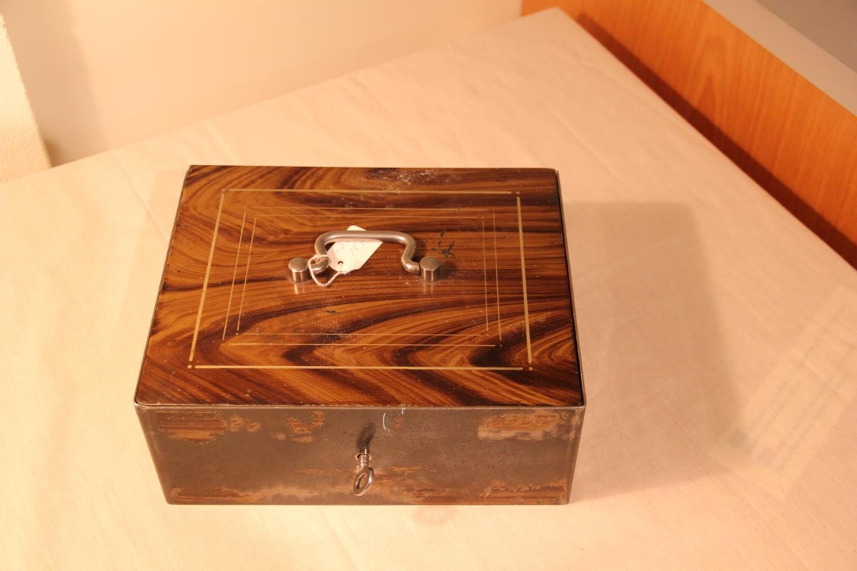 Kassinn er brúnn að lit með stálhandfangi og lykli.