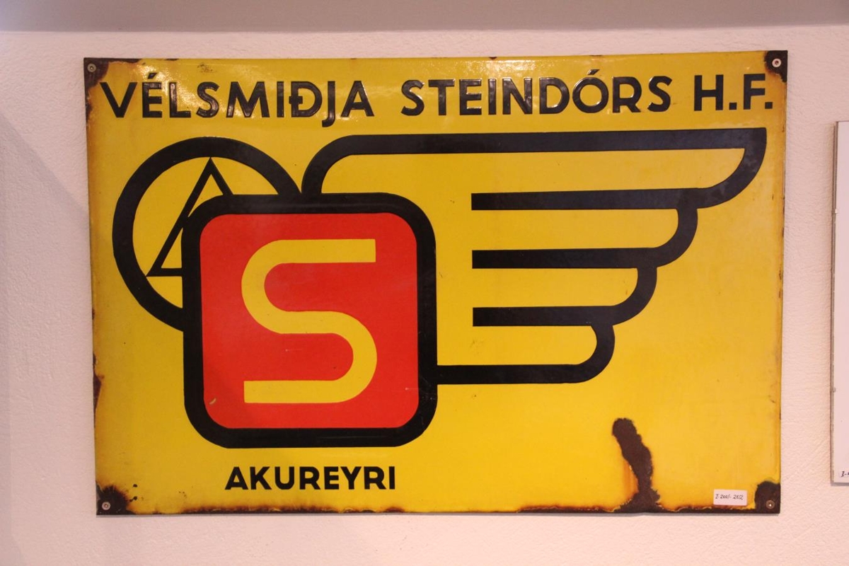 Skiltið er gult, svart og rautt. Á því er nafn og merki smiðjunnar á gulum grunni.