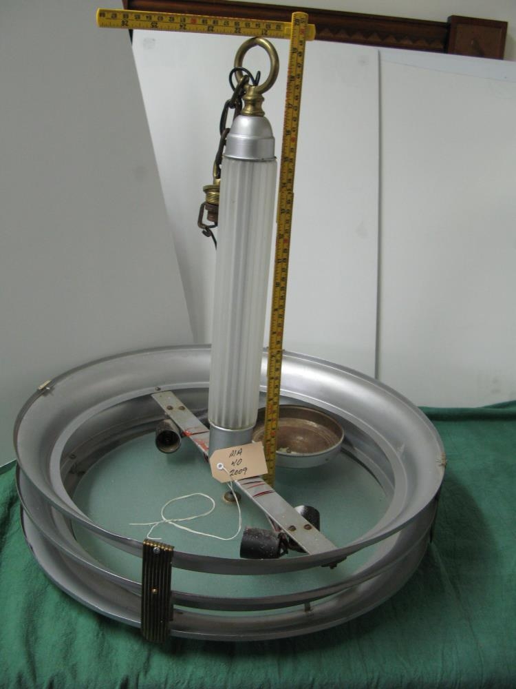 Kringlótt loftljós með gleri í botninum. Þrír hringir úr áli sem festir eru saman á fjórum stöðum með giltum riffluðum lengjum (2,5 cm á breidd x 10 cm á hæð.) Fjögur perustæði eru í ljósinu. Stór glerpípa er upp úr ljósinu með álhettu á hvorum enda. Upp úr endanum að ofan gengur lykkja og keðja (12,5 cm í þvermál). Állok fylgir til að loka rafmagnsdósinni. Ljósið er úr gamla læknabústaðnum að Lagarási 22 Egilsstöðum.