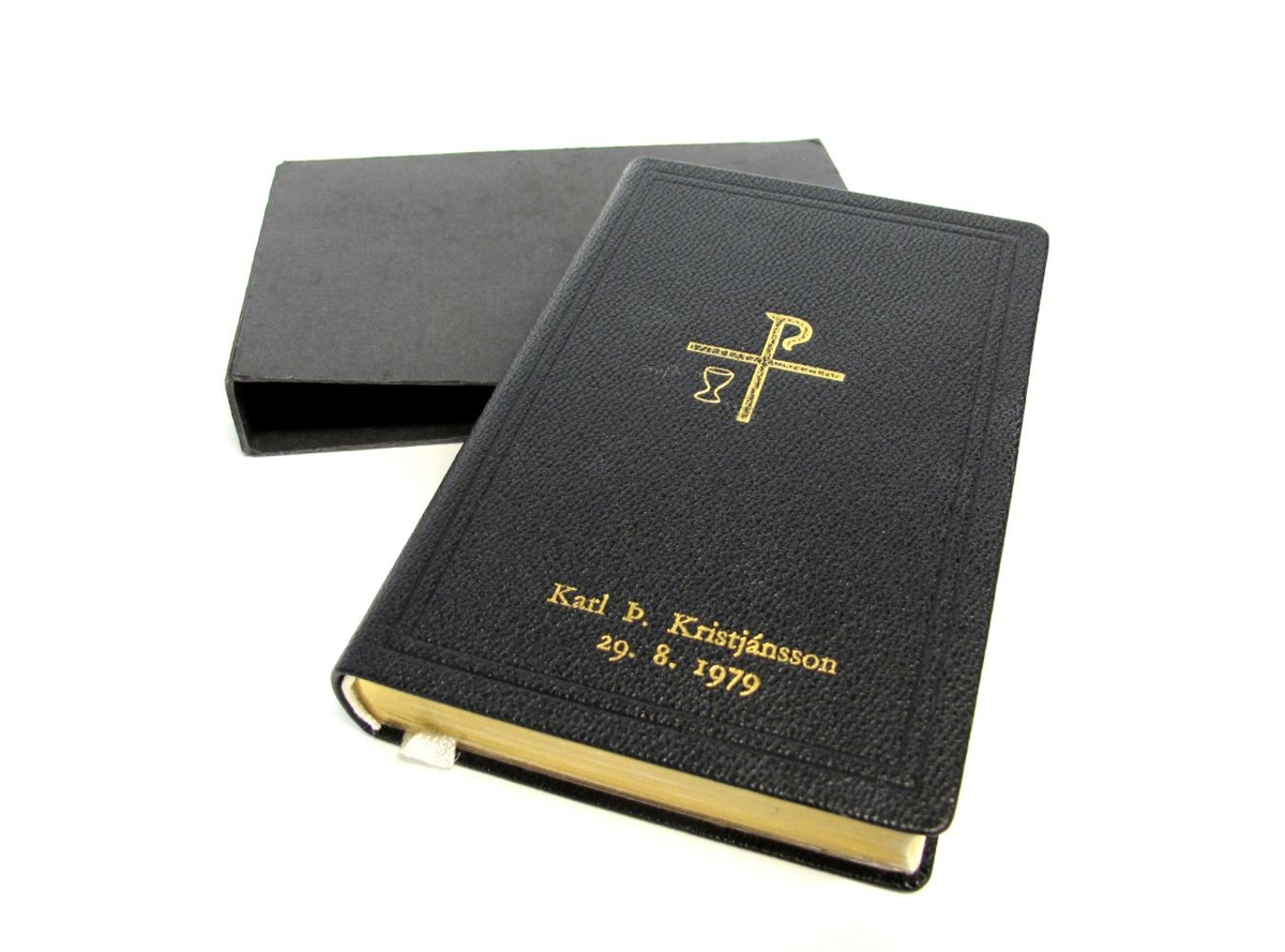 Sálmabók Íslenzku kirkjunnar, útgefin 1975. Hún er í svörtu leðurbandi, skreytt með gyllingu. Bókin er í svörtu hulstri úr pappa. Á titilblaði stendur: