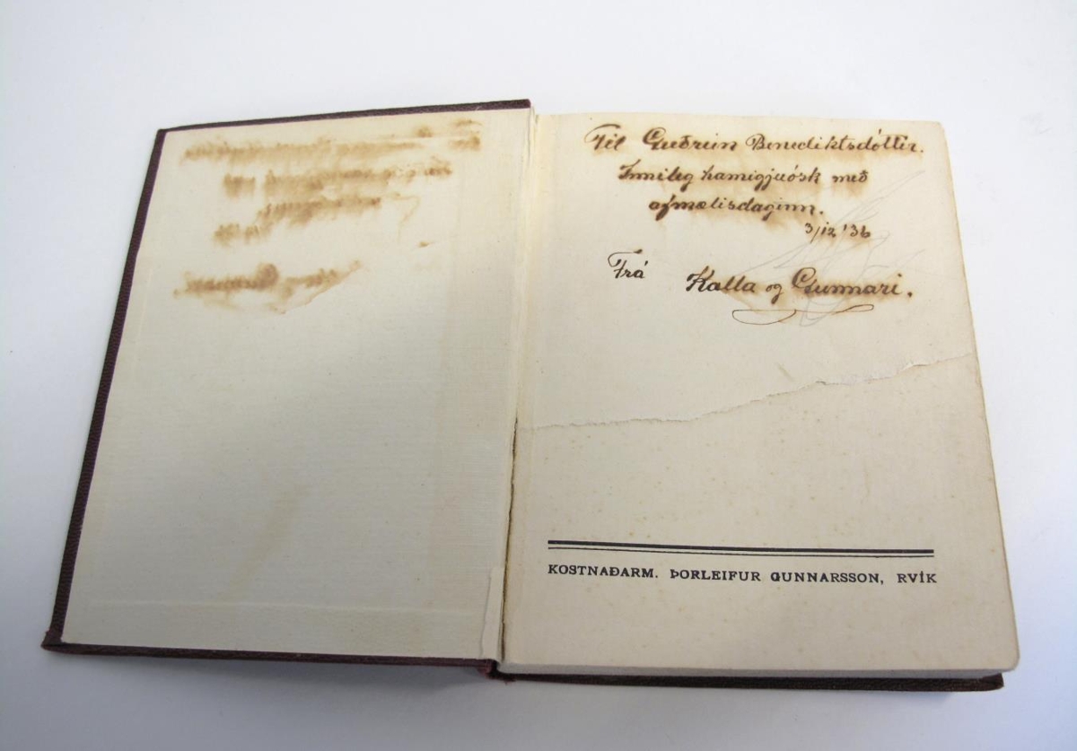 Bókin er úr eigu langömmusystur gefanda, Guðrúnar Benediktsdóttur og á saurblað er handskrifað:
