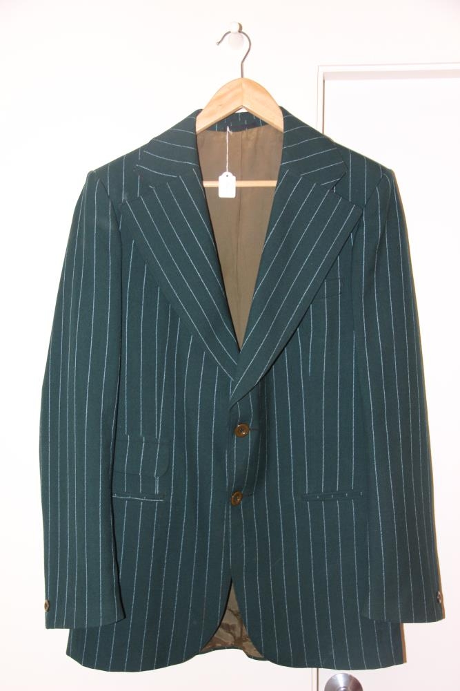 Jakkinn er grænn með bláum teinum. Á merkimiða stendur "Terra fyrir herra".