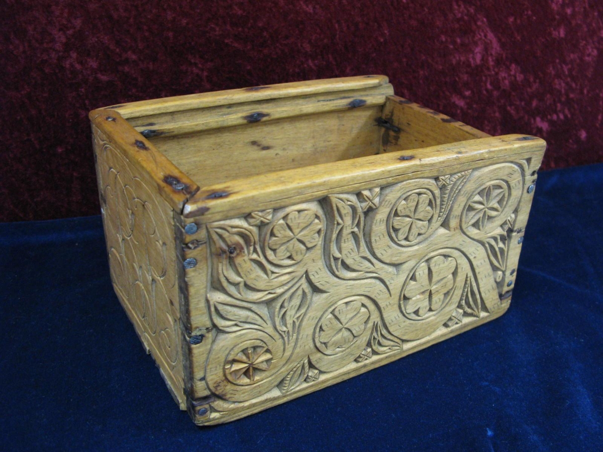 Hefur verið með dragloki sem var glatað er stokkurinn kom til safnsins. Fangamarkið: "B.B." útskorið á aðra skammhliðina og "árið 1896" á hina. Rósaflúr á langhliðum.