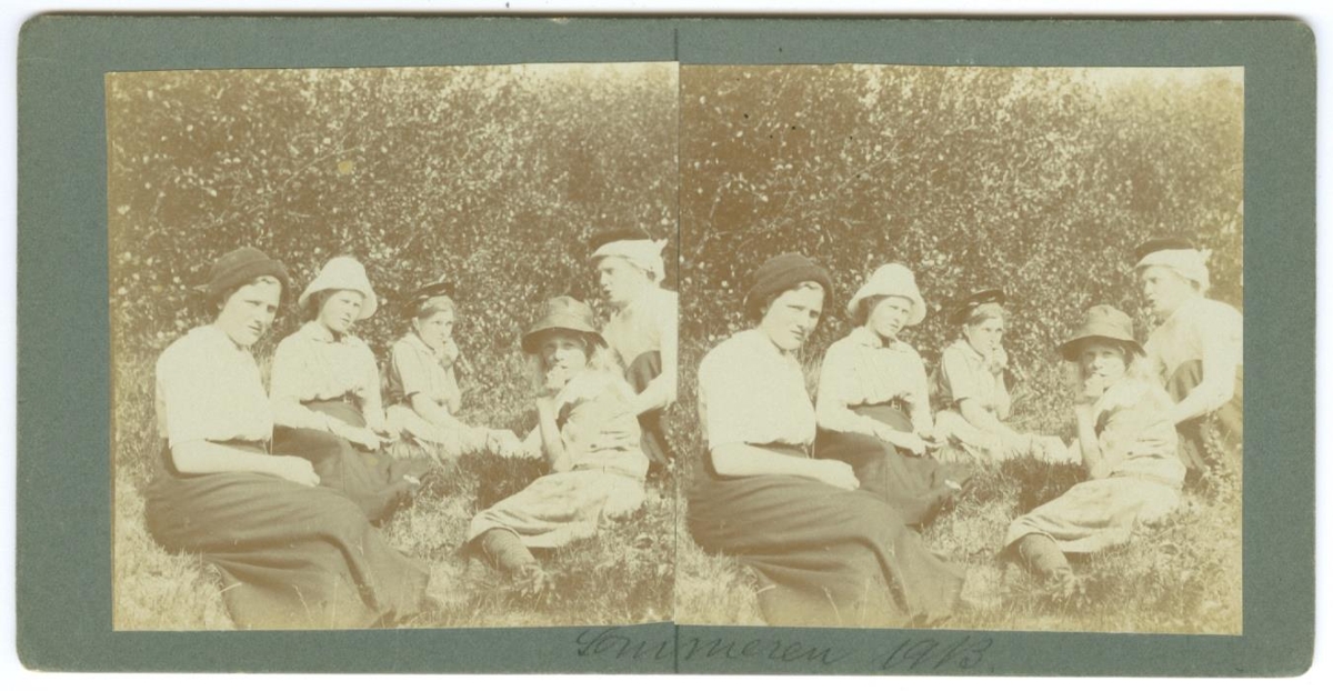 Stereóskópmynd. Fimm kvennmenn sitja í rjóðri. Þetta eru eiginkona Ottó Tulinius og dætur þeirra. Aftan á myndinni stendur: Budda, Gunna, Mouda, Digny, Tane Garda (Tulinius) Akureyri.