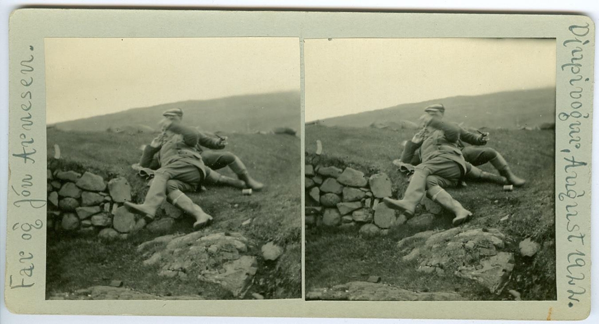 Stereóskópmynd. Tveir karlmenn sitja saman, Þórarinn E. Tulinius og Jón Arnesen.