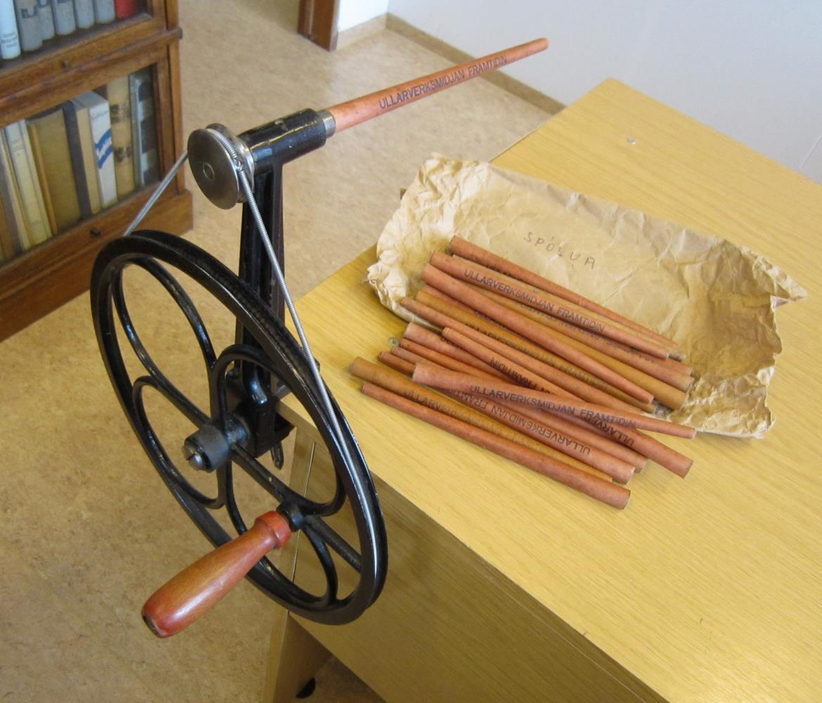 Garnvinda hjól með sveif, sem knýr öxul, sem tiheyrandi spólur eru settar á. Gerð til að festa á borðplötu. Þvermál hjólsins er 30 cm. 23 spólur fylgja og eru þær merktar ”Ullarverksmiðjan Framtíðin” Sú verksmiðja var á Frakkastig 8 og hafði umboðsmenn í flestum kaupstöðum og kauptúnum á landinu.