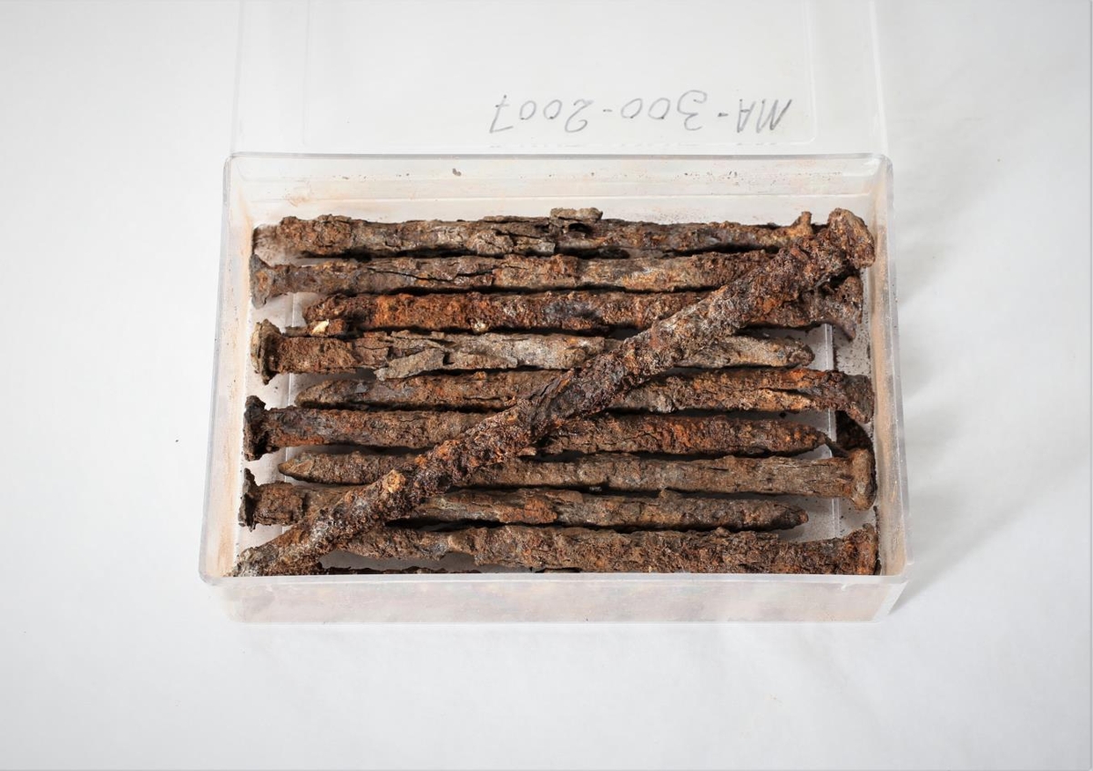 Ellefu stykki naglar sem fundust í húsagrind sem var verið að gera við í Húsey í Hróarstungu. Einn er 13 cm langur, níu eru 10 cm langir og einn er 8 cm langur. Naglarnir mjög ryðgaðir. Einhverjir þeirra eru líklega heimagerðir en ekki allir.