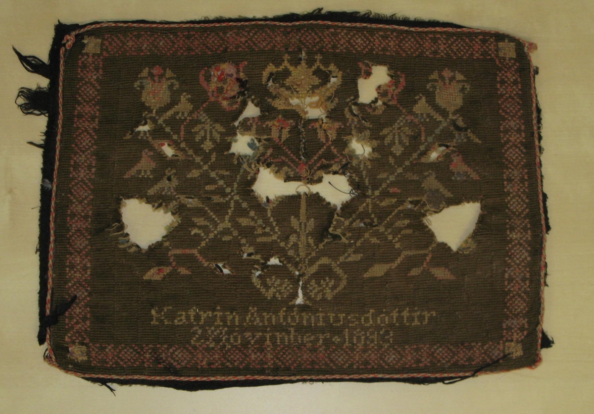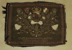 Grænt söðulsessuver, orðið mjög slitið. Rósir og fléttur útsaumaðar í stramma, mjög slitið. Einnig útsaumað: "Katrín Antoníusdótir 2.Nóvinber 1893". Er nr. 166b í Minjasafnsskrá. Var eign Katrínar Antoníusdóttur, móður gefanda. Trúlega hefur Katrín saumað sjálf.