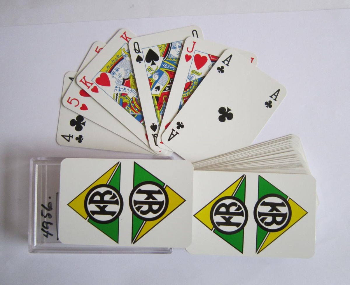 Spilastokkur í plasthulstri, spilin eru með KB (Kaupfélag Borgfirðinga) merki á bakhlið, mjög lítið notuð.