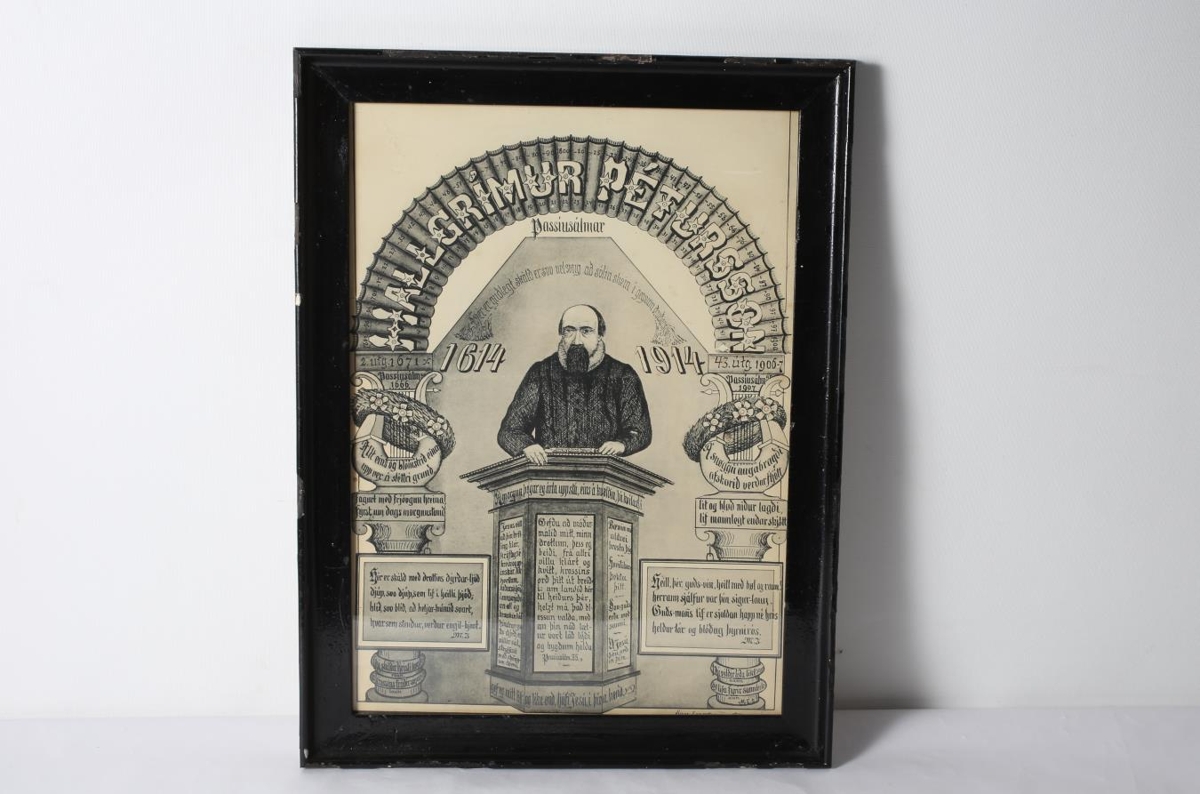 Mynd af Hallgrími Péturssyni í svartlökkuðum ramma. Úr búi foreldra gefanda, Guðnýjar Pétursdóttur og Guðna Jóssonar frá Reykholti á Eskifirði. Myndin hékk alla tíð uppi í svefnherbergi þeirra hjóna. Steinunn man eftir myndinni frá því hún var smástelpa.