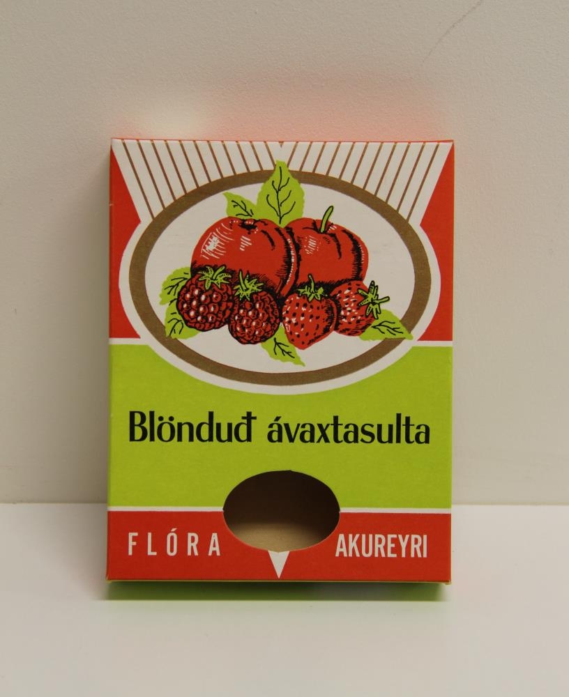 Pappaöskjur - hvítar, brúnar, rauðar og grænar að lit. Í öskjurnar voru settir hitalokaðir pokar með sultu í. Texti að framan: Blönduð ávaxtasulta - Flóra - Akureyri. Á baklhlið er mælt með öðrum bragðtegundum s.s. hindberjasultu og jarðarberjasultu.