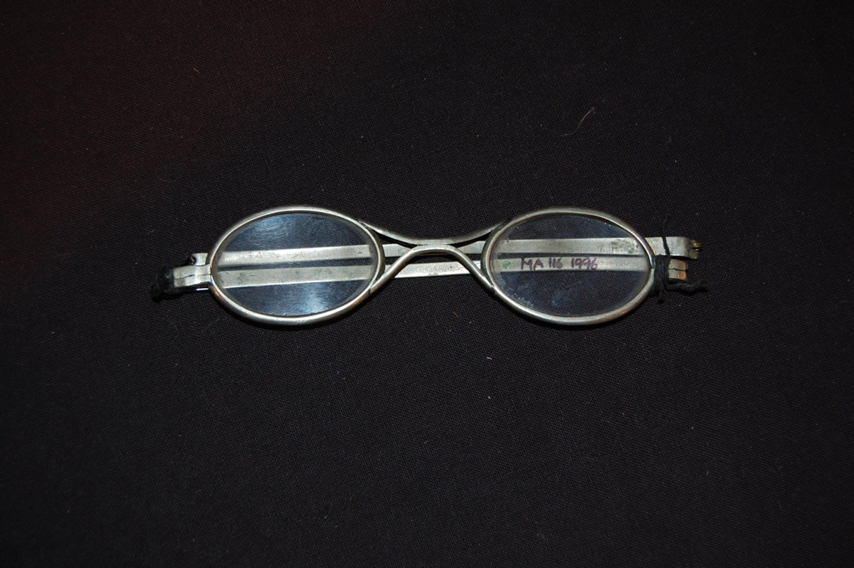 Silfurspangargleraugu síðan um aldamót eða fyrr. Annar armurinn er laus, hinn festur við með svörtum tvinna. Eigandi var langamma gefanda, Ljósbjörg Magnúsdóttir (f.08.01.1848), húsfreyja á Freyshólum í Vallahreppi. Guðjón Jónsson, snikkari á Reyðarfirði, hagur bæði á járn og tré, sonur Ljósbjargar smíðaði gleraugnahúsið.