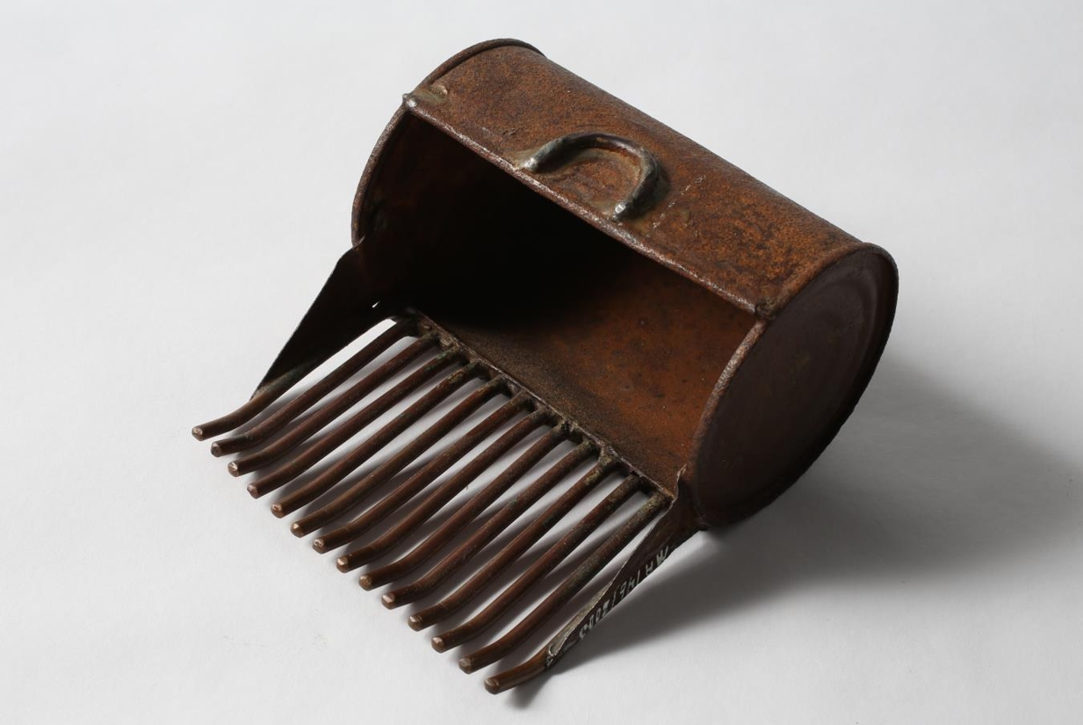 Niðursuðudós sem búið er að skera brot af annarri hliðinni til að búa til berjatínu. Járntindar stingast út úr annarri hliðinni. Á botni niðursuðudósarinnar er skammstöfunin S.J. Hluturinn var í eigu hjónanna Karls Nikulássonar og Önnu Bjargar Sigurðardóttur frá Gunnlaugsstöðum á Völlum. Notað við berjatínslu.