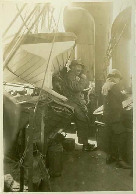 Karlmaður og drengur um borð í skipi. Karlmaðurinn er að gæða sér á harðfiski.