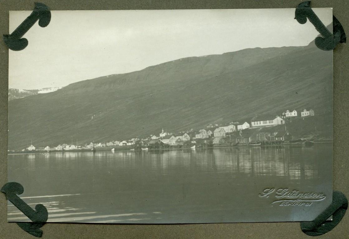 Póstkort með mynd af Eskifirði séð frá sjó.