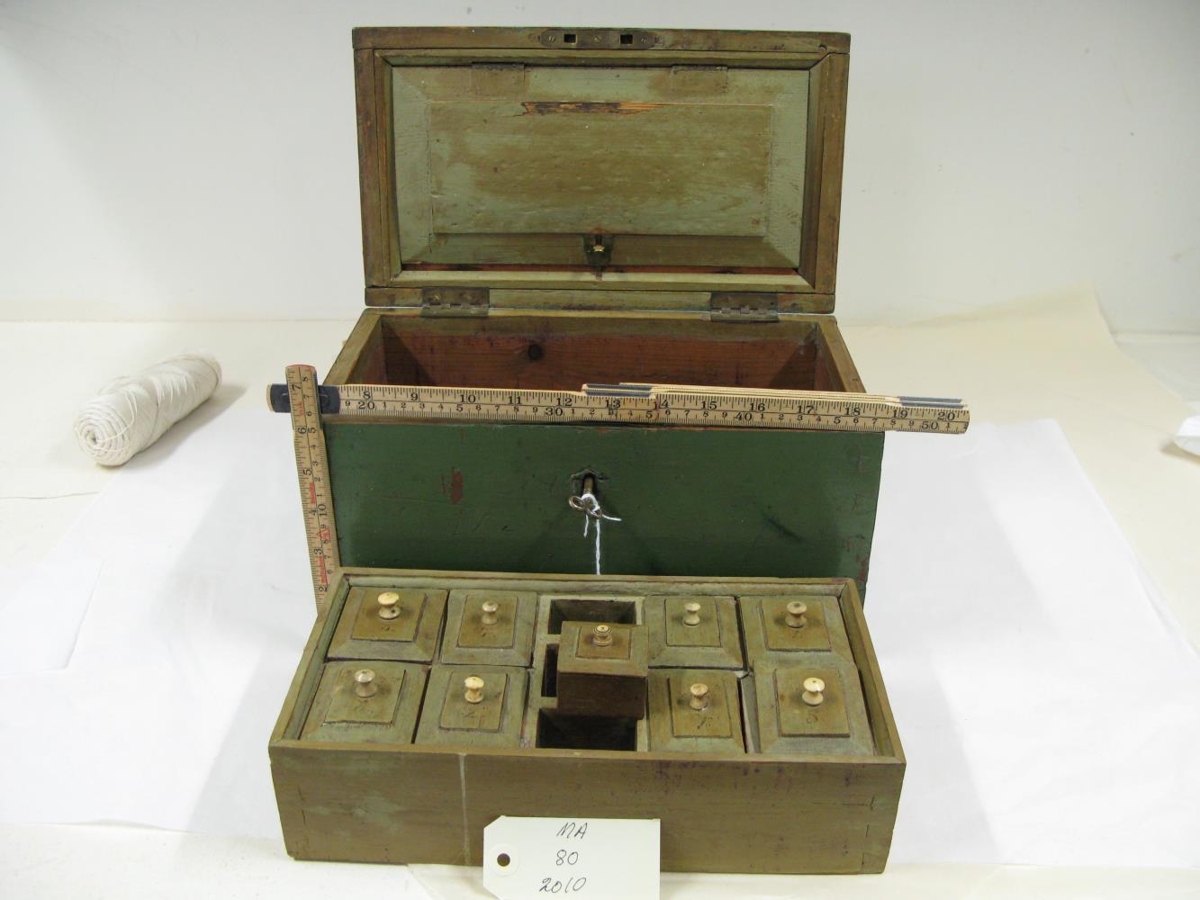 Grænn kistill. Aðalhólf hans er tvískipt og efra hólfið (sem tekið er uppúr) er allt hólfað niður í lítil hólf sem hvert og eitt er með flutningaloki. Upp úr lokunum gengur renndur pinni úr beini (líklega hrosslegg). Í miðju eru þrjú hólf án loka en niðri í miðhólfinu er lítill kassi sem líklega er ætlaður undir skartgrip. Til hliðar við þessi þrjú hólf eru fjögur hvoru megin og stendur á lokunum (málað á) "No. 1. til 8". Í loki kistilsins er einnig hólf.