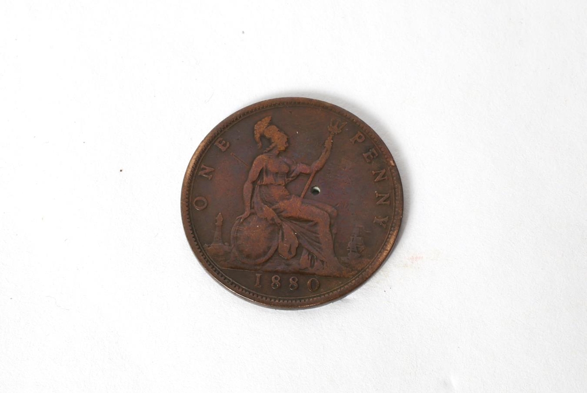 Mynd af Victoriu drottningu á peningum og á honum stendur "Victoria D.G Britt. REG.:FD:" og á bakhlið "One Penny 1880. Fannst í jörðu á Dvergasteini við Seyðisfjörð þegar grafið var fyrir hlöðu í kringum 1946.