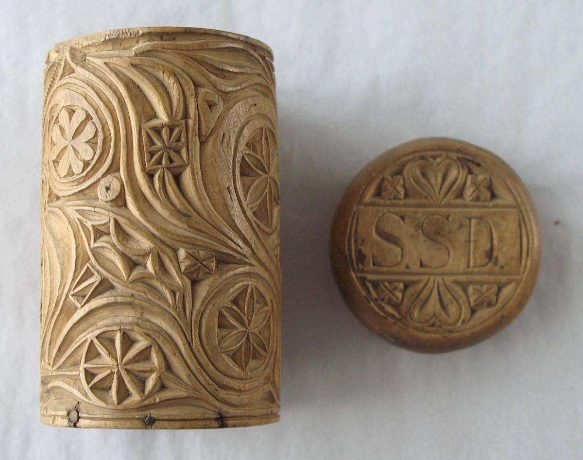 Útskorinn, kringlóttur. Áletrun á loki S.S.D. á botni:1887. Sigurbjörn Jóhannsson kom 16/4 2003 á safnið og skýrði frá því að samkvæmt munnlegum heimildum frá móður hans, sem er gefandi, hafi Einar Long skorið út baukinn. Telur hann að S.S.D. standi fyrir Stefaníu Sigurbjörnsdóttur sem fædd var 1894 og gæti ártalið staðið fyrir árið sem Einar kom sem vinnumaður í Blöndugerði. Ómálaður. Önnur saga um gripinn er skrásett 23. júní 2004 og höfð sú athugasemd eftir frá Stefaníu Sigbjörnsdóttur að Einar var vinnumaður að Litla-Bakka, samtíða Signýju Stefánsdóttir sem var á líkum aldri og Einar. Hún var systir Vilborgar, dóttur Stefáns Sigurðssonar og Málfríðar Jónsdóttur að Litla-Bakka. Einar hefur líklega gefið Signýju baukinn. Signý dó 1895 eða 1894 af inflúensu. Vilborg, amma Sigurbjörns, hefur líklega fengið baukinn. Stafirnir á bauknum því stafir Signýjar.