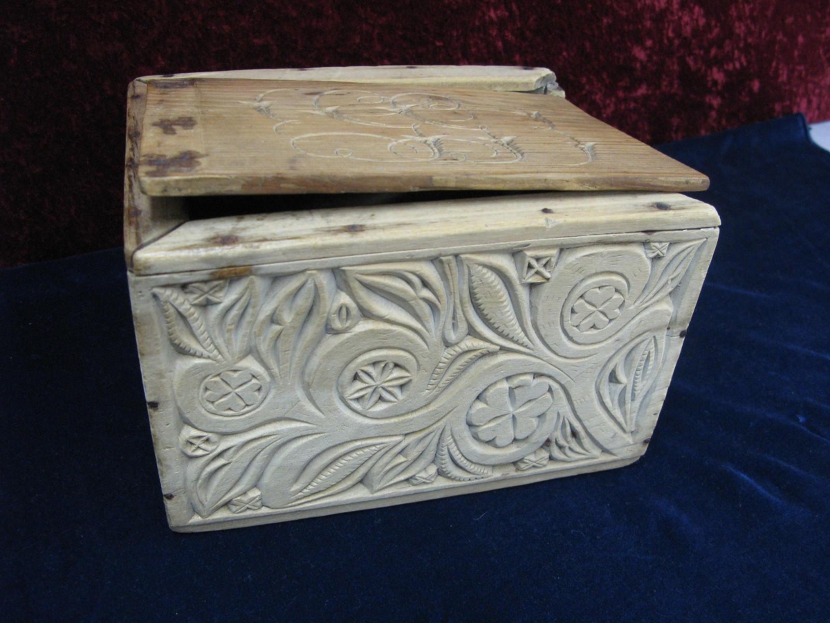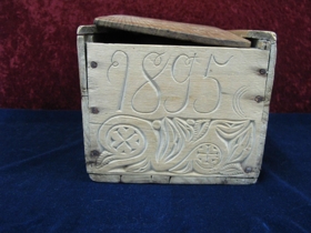 Útskorinn trékistill frá 1895. Kassi, skorinn út af Einari Long á Hallormsstað, með lélegum vasahníf. Gaf hann Guðrúnu Gunnarsdóttur á Valþjófsstað, síðasta veturinn sem hún var á Brekku hjá afa sínum og ömmu. Hún flutti að Ljótsstöðum I í Vopnafirði. Gaf kassann Önnu Sólveigu Gunnarsdóttur, Ljótsstöðum I í Vopnafirði.
