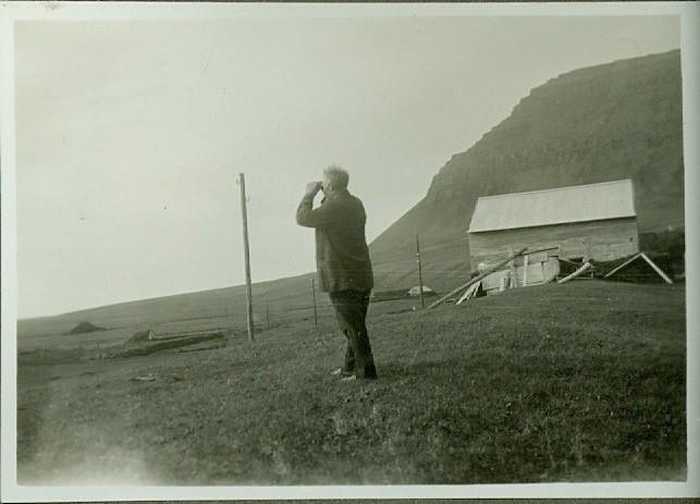 Hákon í Haga stendur úti á túni og virðist vera að líta í sjónauka.