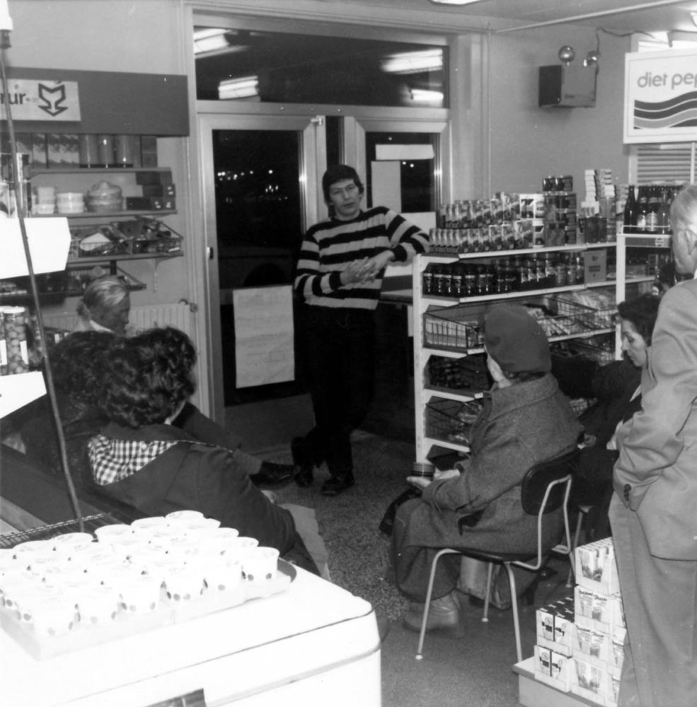 Búðarfundur KEA í Alaska 1981. Kaupfélagið bauð reglulega viðskiptavinum sínum, sem oftast voru húsmæður í næsta nágrenni, á til skrafs og ráðagerða. Þá voru kynntar nýjar vörur og tækifæri gafst til að heyra í þeim sem nýttu sér þjónustu búðarinnar. Fyrirmyndina hafði KEA frá Bandaríkjunum.