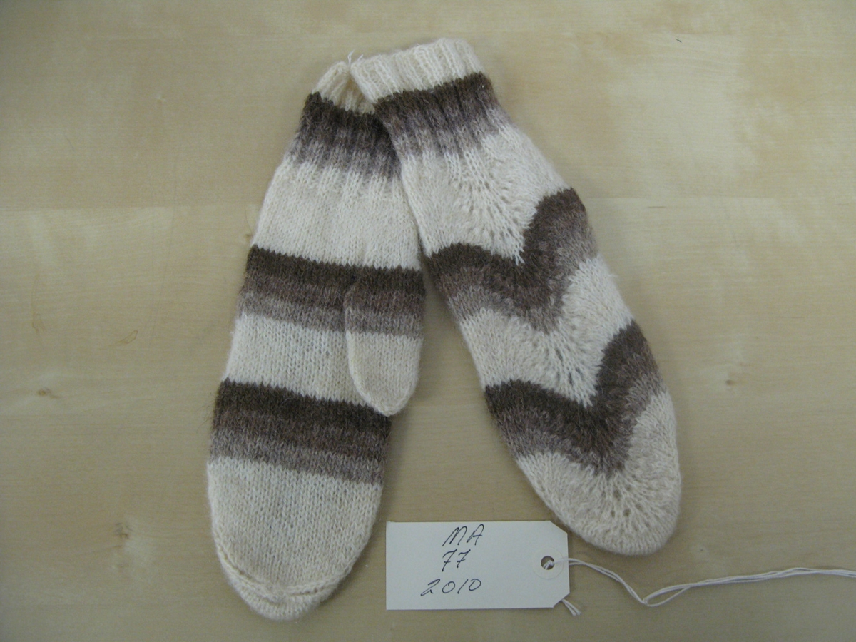Hvítir útprjónaðir vettlingar með þremur mismunandi mórauðum röndum og útprjóni á handabakinu. Salbjörg Jóhannsdóttir prjónaði þessa vettlinga 1945 og gaf Sigrúnu Einarsdóttur (sem nú býr á Miðhúsum) sem bjó þá á Bæjum á Snæfjallaströnd. Salbjörg var ljósmóðir við innanvert Ísafjarðardjúp og var oft kennd við bæinn Tyrðingsmýri.