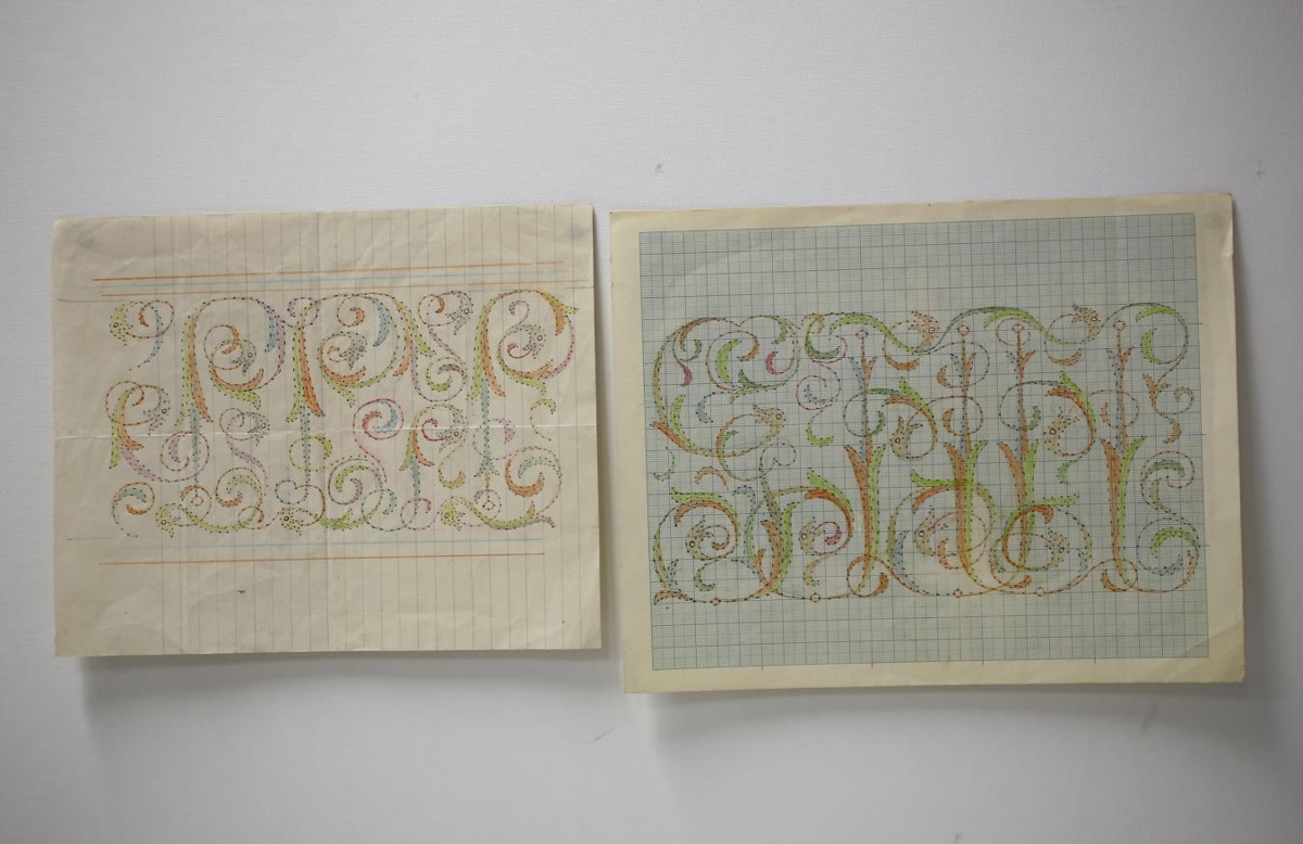 Skrautstafir á pappír, formaðir með blekpunktalínu og blýantsstriki og litaðir með trélitum. Gerðir af Einari Long handa Kristínu Í. Þorleifsdóttur, KÍÞ. Einar Long gerði stafi handa Gerði og móður hennar (sjá MA-1998-76). Afhent safninu af Dagnýju Karlsdóttur, skólasystur gefanda.