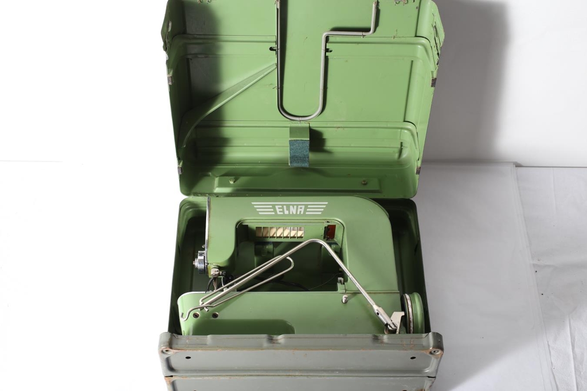 Saumavél af gerðinni "Elna", græn að lit í gráum járnkassa. Móðir gefanda, Aldís Pálsdóttir, átti og fékk þegar hún bjó á Skeggjastöðum 3 í Fellum.