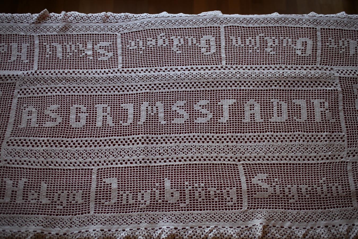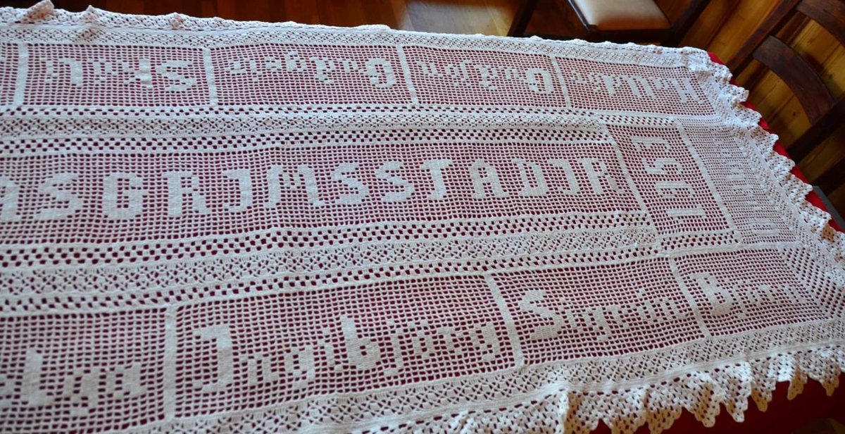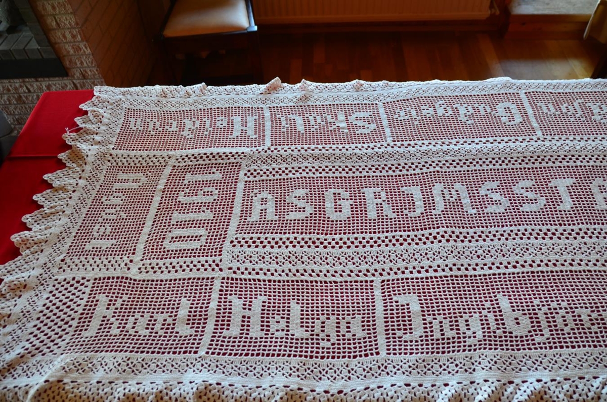 Hvítur, heklaður dúkur. Heklaður af Guðbjörgu Alexandersdóttur sem gift var Vilhelm Ágústi Ásgrímssyni frá Unaósi. Þau bjuggu á Ásgrímsstöðum í Hjaltastaðaþinghá á árunum 1925-1961. Í miðjan dúkinn er heklað bæjarnafnið "Ásgrímsstaðir", ártalið 1953 og giftingarár þeirra hjóna 1910. Nöfn þeirra hjóna og barnanna þeirra eru hekluð á jaðrana. Nöfnin eru: Ágúst, Guðjón, Guðbjörg, Skúli, Ingibjörg, Karl, Helga, Sigrún, Björn, Heiðrún, Guðgeir og Halldór. Dúkurinn var notaður við hátíðleg tækifæri og þá hafður rauður dúkur undir.