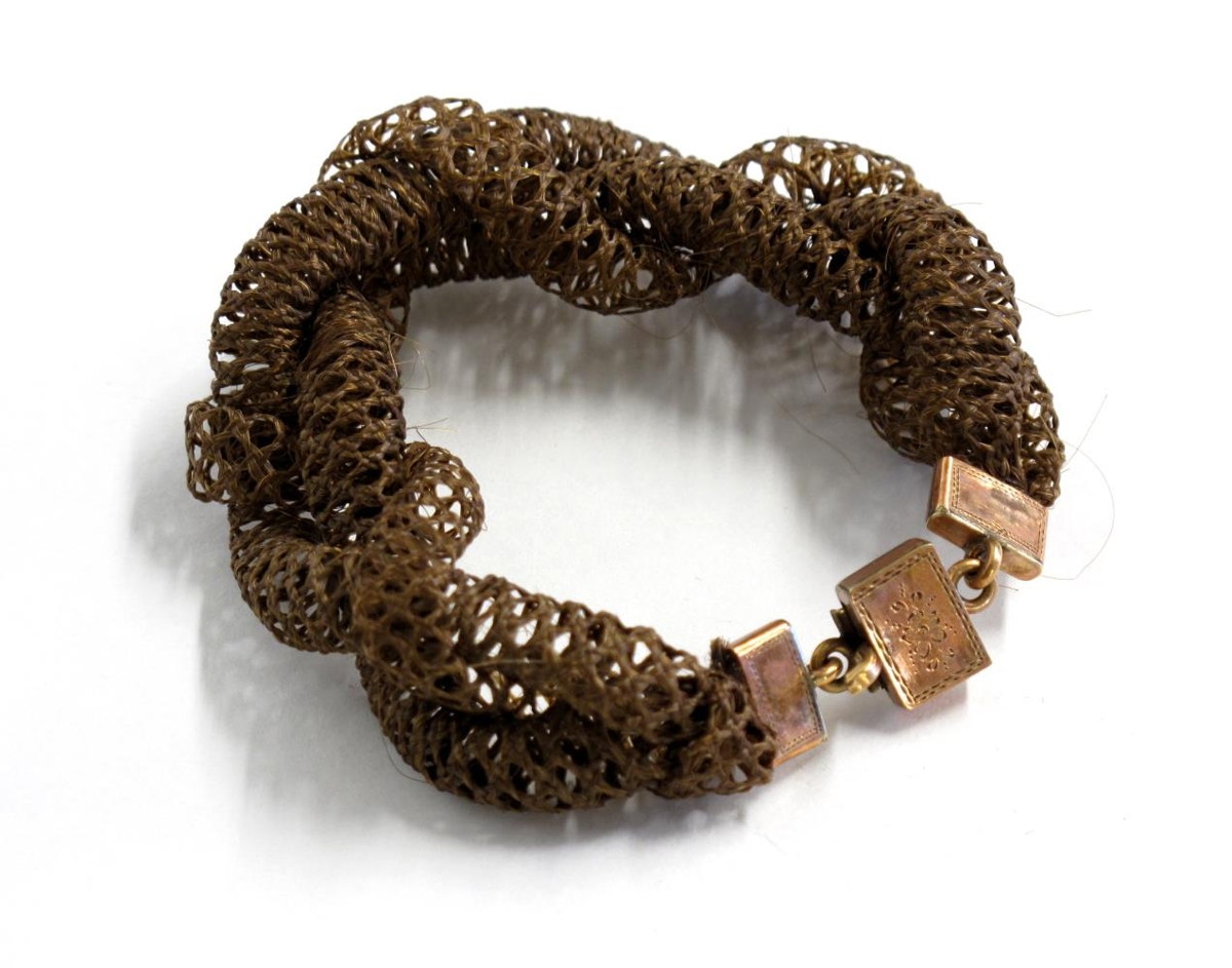 Armband, fléttað úr mannshári, með festingum úr gylltum málmi, skreyttum. Mannshárið er fyrst fléttað í þrjár sívalar lengjur, holar að innanverðu, og þær þrjár svo fléttaðar saman. Armbandið er heilt og í góðu ástandi.
