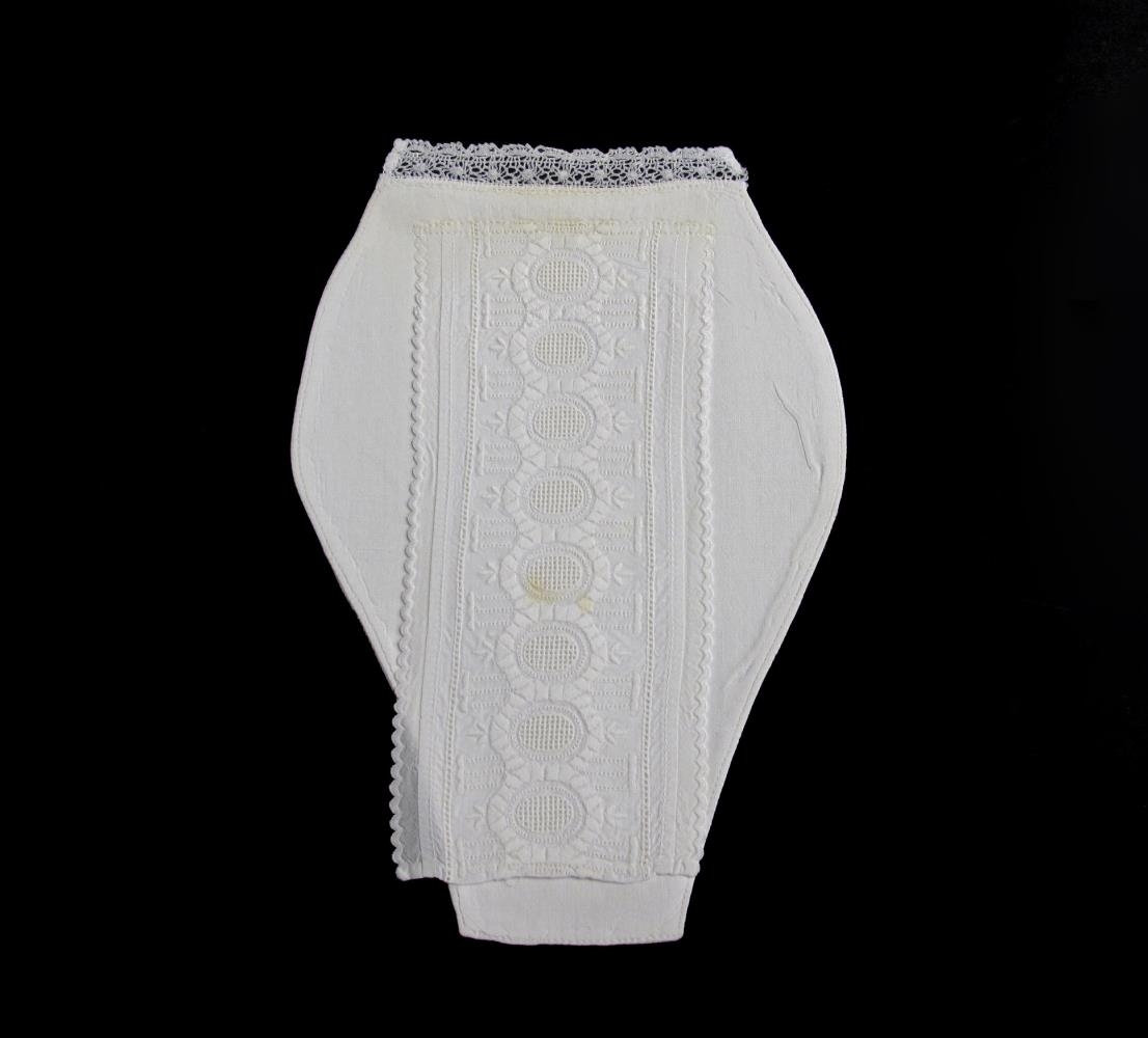Peysubrjóst úr hvítu lérefti, stífað. Fremra stykkið er breið blúnda, vélgerð. Efst er peysubrjóstið skreytt með heklaðri eða kniplaðri blúndu. Það er í mjög góðu ástandi en örlítið fyrir neðan miðju er smávegis blettur eftir eitthvað sem hefur sullast niður á peysubrjóstið.