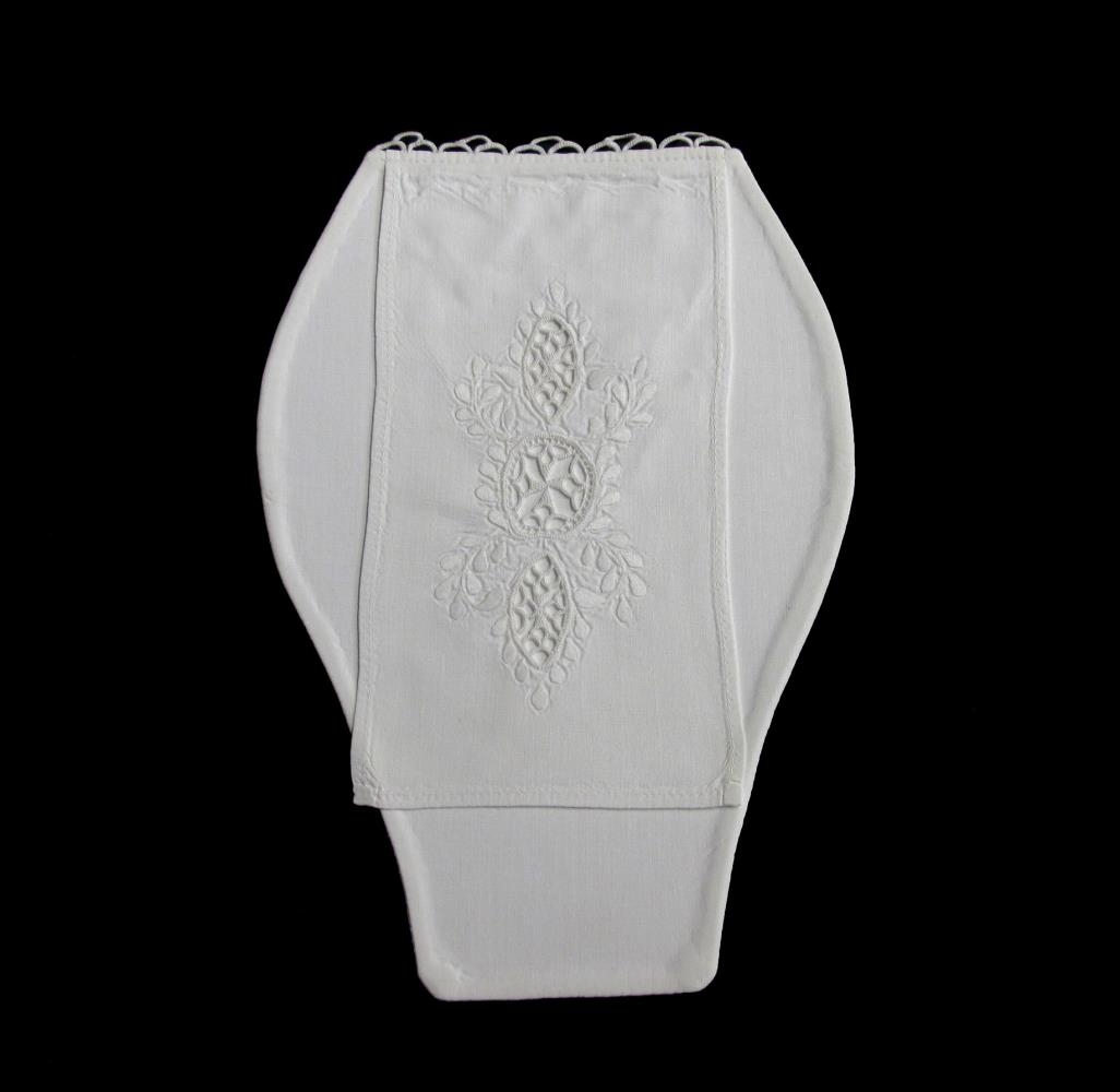 Peysubrjóst úr hvítu lérefti, stífað, fremur stórt og breitt. Framstykkið er skreytt flatsaumi og klippt úr þrjú stór göt og heklað skraut inn í. Efst er blúnda úr hekluðum snúrum. Peysubrjóstið er í mjög góðu ástandi og virðist lítið sem ekkert notað. Á bakhlið þess hafa verið skrifaðir stafirnir SF. Ekki er vitað hverjum þeir tilheyrðu og því óljóst hver átti peysubrjóstið.