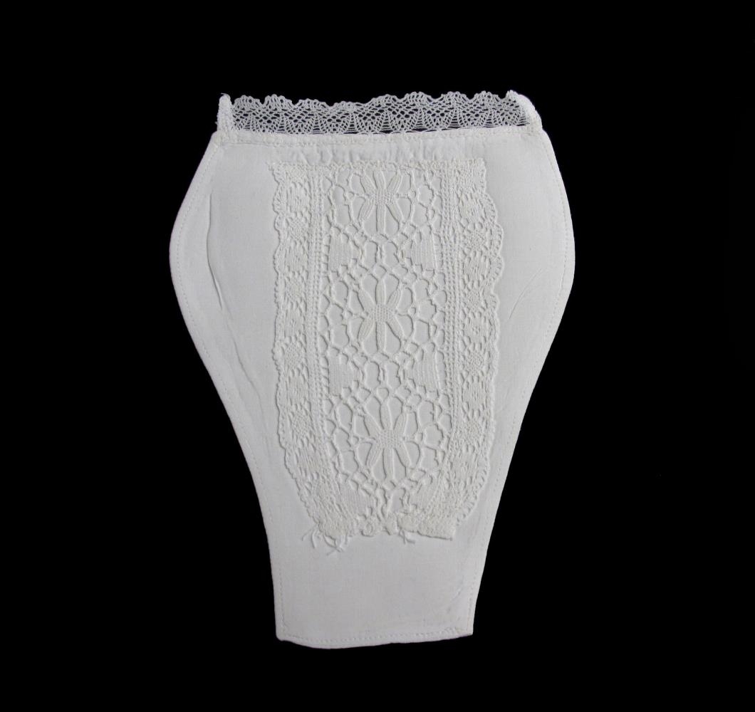 Peysubrjóst úr hvítu lérefti, stífað. Það er óvenju breitt. Að framanverðu er það skreytt með breiðri, fíngerðri, heklaðri blúndu og að ofanverðu er ennfremur knipluð blúnda. Peysubrjóstið er í mjög góðu ástandi og virðist lítið sem ekkert notað.