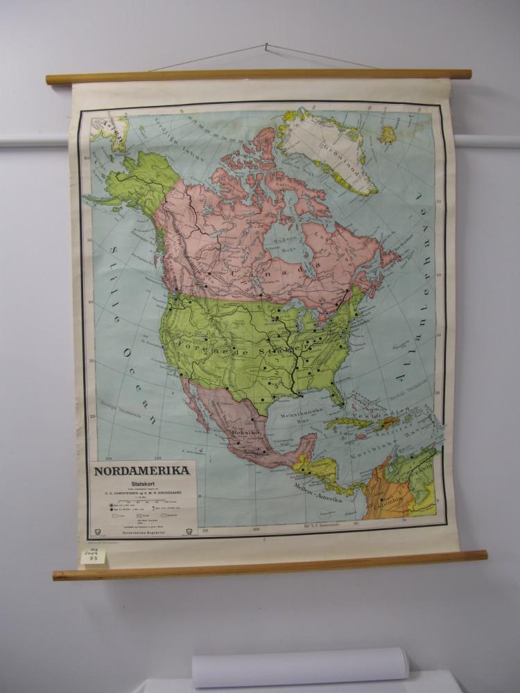 Landakort af Norður-Ameríku, á dönsku. Kennslugagn úr Fellaskóla. Kennari: Garðar Pálsson. Kenndi allar greinar. Skólinn var oft að Skeggjastöðum II á milli 1960-1970. Skólinn var haldinn í fimm herbergjum á loftinu. Sér herbergi voru fyrir börn sem voru í "heimavist". Ein stofa í húsinu var tekin undir kennslu, en í húsinu voru alls þrettán vistarverur.