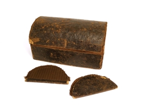 Lítill kistill eða skrín úr leðurklæddum pappa, með læsingu að framanverðu úr koparblöndu. Lykil vantar. Lokið er kúpt, hliðar þess hafa losnað frá en þær fylgja með. Leðrið er orðið mjög snjáð. Að innanverðu er skrínið klætt með brúnu efni. Ekki er vitað undir hvað skrínið var notað en líklega var það undir skart og / eða aðra smáhluti.