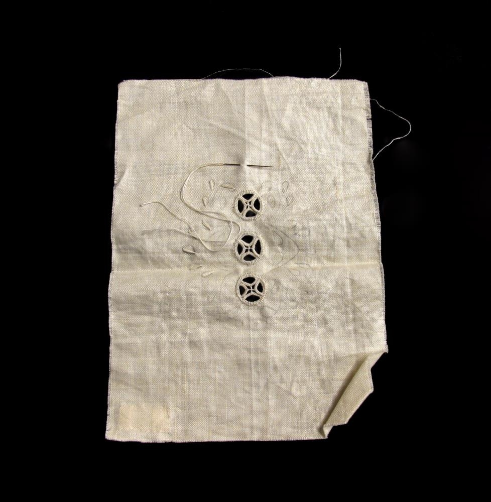 Peysubrjóst, óklárað. Það má því allt eins kalla þetta útsaumsprufu. Hefur átt að vera framstykki peysubrjósts en aldrei hefur verið lokið við útsauminn. Þrjú, lítil, hriglaga göt hafa verið klippt á efnið og saumað inn í og meðfram brúnum. Á efnið er svo teiknað, með blýanti, mynstrið sem ekki hefur verið saumað og hefur það hugsanlega átt að hafa verið með flatsaumi (eins konar lauf og / eða dropar). Útsaumsnálin með spotta af útsaumsgarninu fylgir. Sjá einnig sambærilega prufu nr. Þjms. 2013-101-11.