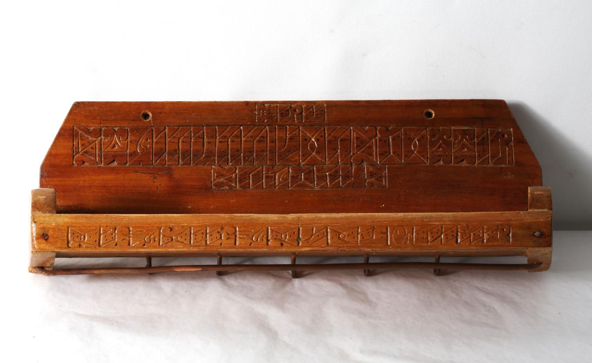 Lítil hilla og fatahengi. Útskorin með höfðaletri: "Frú Steinunn Jónsdóttir Snædal. Gleðileg jól og nýár." Jón A. Stefánsson gaf Steinunni hlutinn.