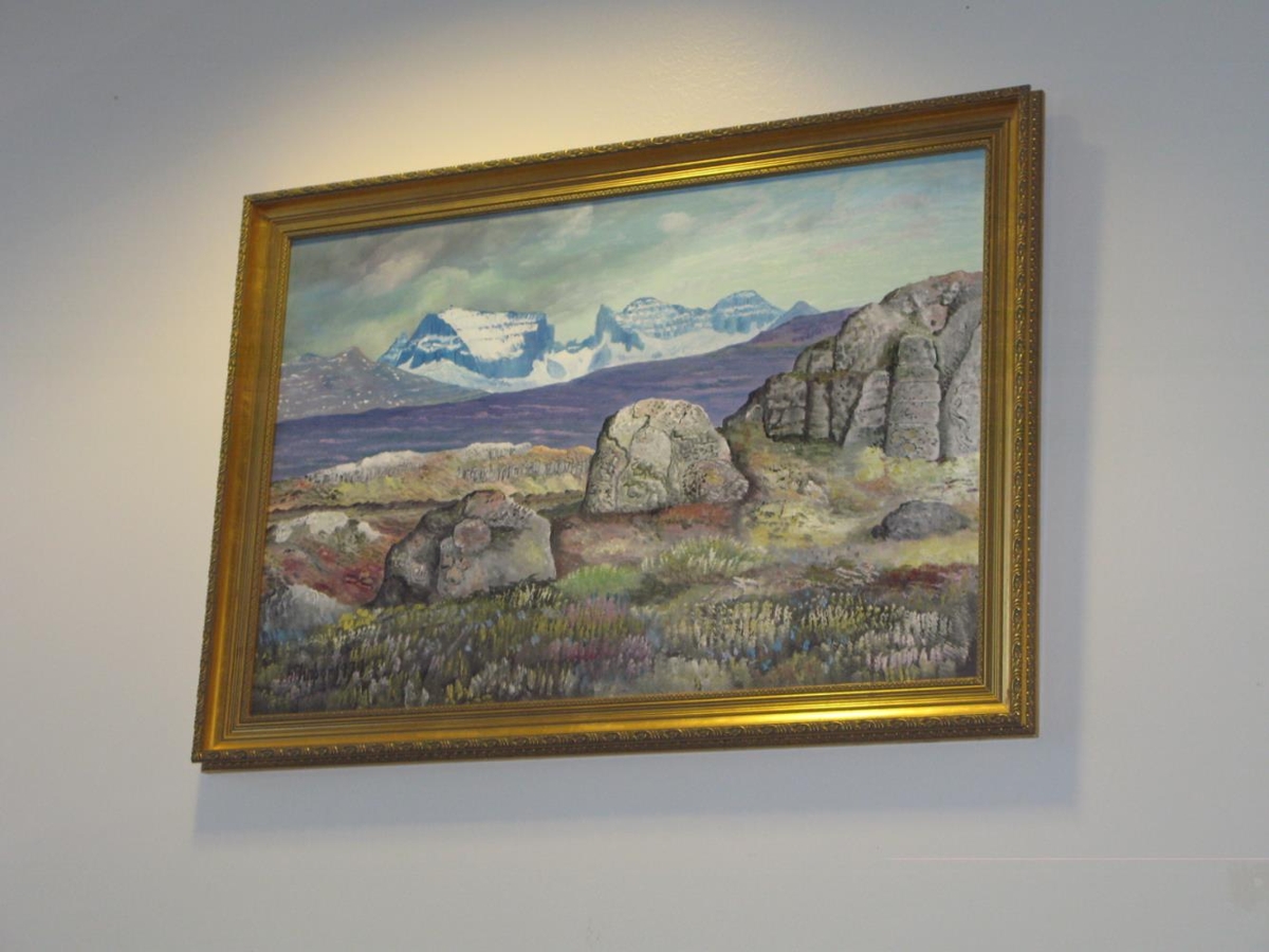 Olíumálverk af Dyrfjöllum í gylltum útflúruðum ramma. Úr búi foreldra gefanda, Sveins Einarssonar frá Hrjót og konu hans, Guðrúnar Bjargar.