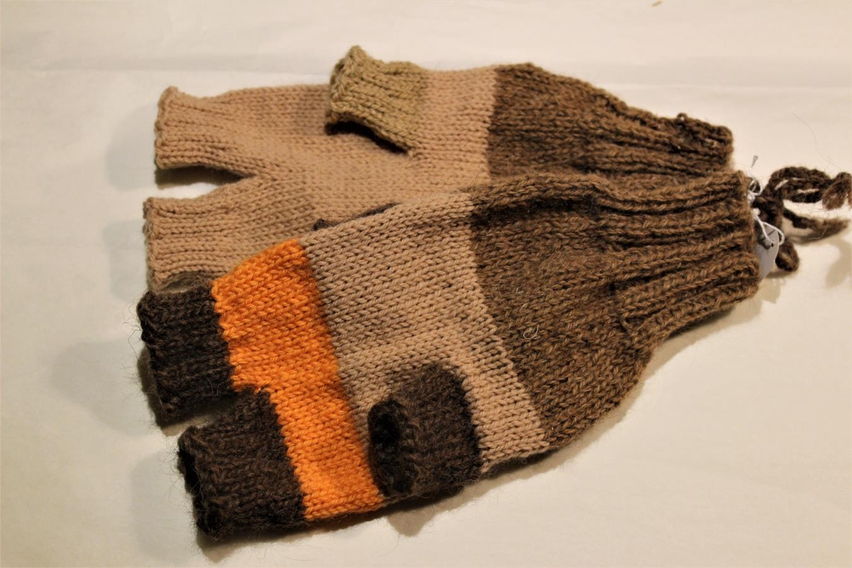 Hrífuhanskar, eftirgerð gamalla mölétinna hanska, Guðfinnu Árnadóttur í Efri- Kvíhólma. Mismunandi litir. Guðfinna hafði notað bandafganga í prjónið, þessir prjónaðir af Guðrúnu Tómasdóttur í Skógum.
