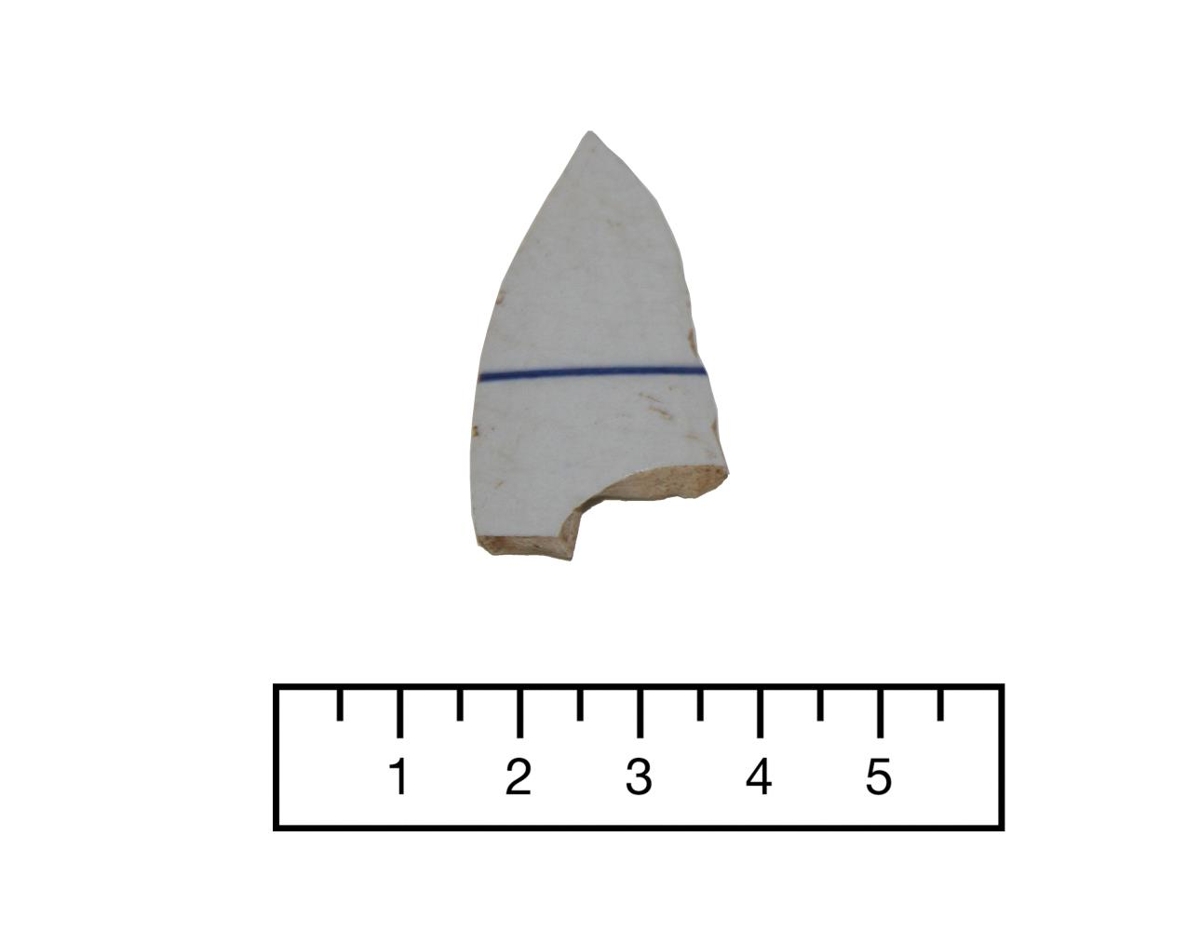 Hvítglerjað brot með blárri línu á annarri hlið. Sennilegast brot úr skál eða bolla.