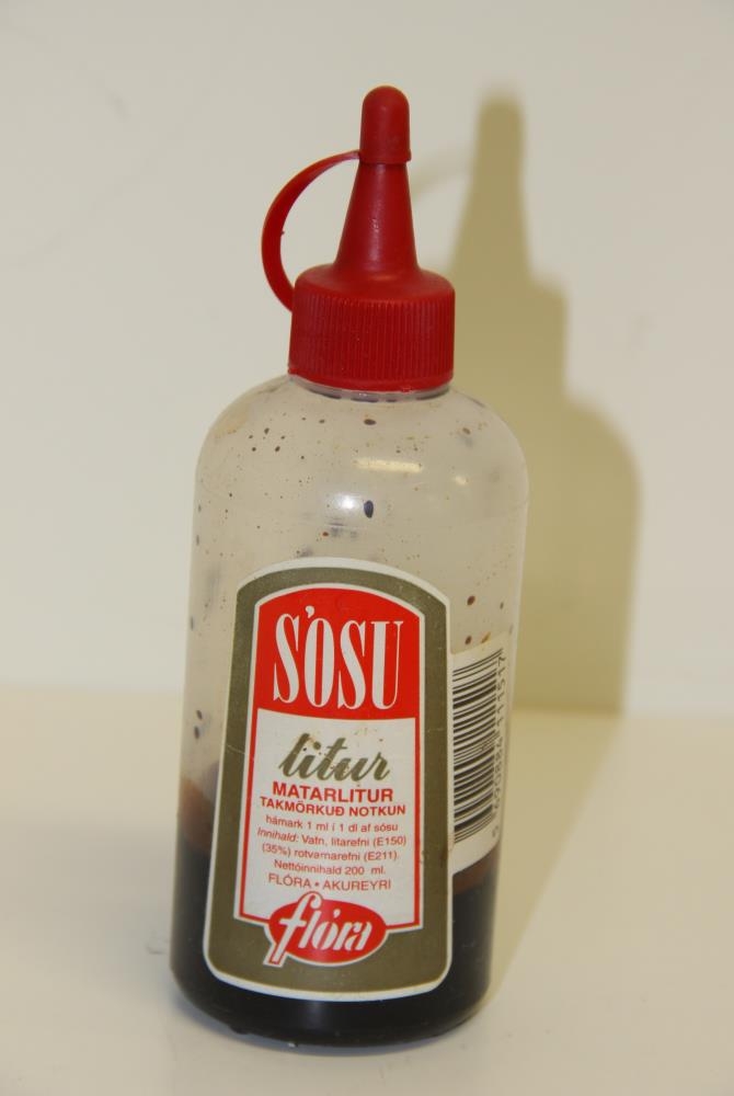 Dökk plastflaska með rauðum tappa og sprautustút. Áletrun á álímdum miða, hvítum í grunn með rauðu og gylltu prenti: Sósulitur. Matarlitur, takmörkuð notkun, hámark 1 ml. í 1 dl. af sósu. Innihaldslýsing. flóra(vörumerkið með litlum staf) Flaskan er 5 cm. í þvermál.