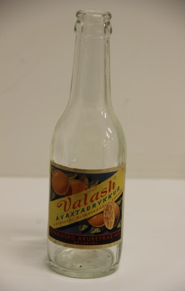 Glær glerflaska fyrir gosdrykk. Áletrun á álímdum miða í mörgum litum: Valash ávaxtadrykkur. Hressandi - blóðaukandi - svalandi. Mynd af appelsínum. Efnagerð Akureyrar hf. Akureyri. Á botni flöskunnaar er upphleypt: H Mineralvand. Flaskan er 5,5 cm. í þvermál.