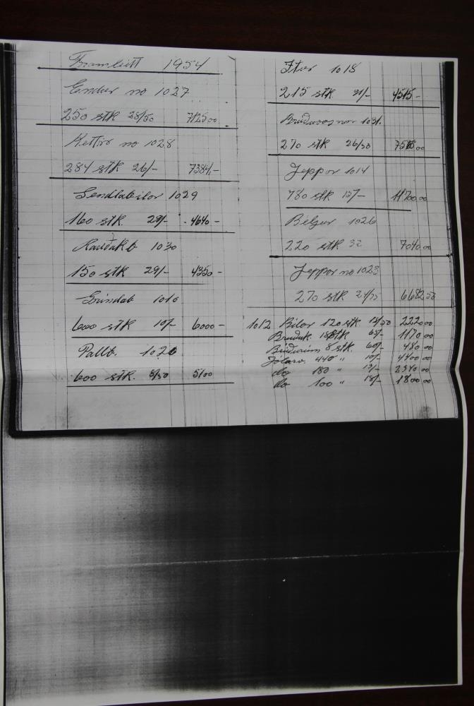 Ljósrit af blöðum í Framleiðslubók Leifsleikfanga á Akureyri fyrir árin 1954 - 1959.