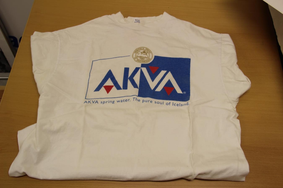 Hvítur T-bolur með áprentun í bláum, rauðum og gylltum lit. Merki Hesjuvallalinda (í gylltu). AKVA. Akva spring water. The pure soul of Iceland.