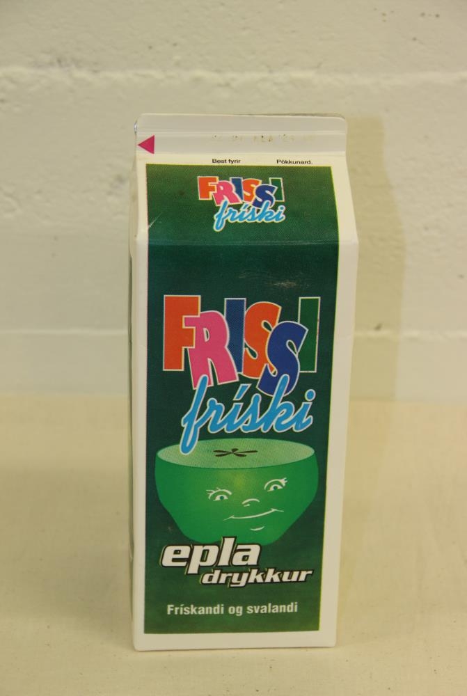 Pappaferna, klædd álpappír að innan, undir 2 lítra af ávaxtadrykk. Áprentun í mörgum litum, grunnlitur grænn. Þrjár hliðar: Frissi fríski epladrykkur. Teiknað hálft epli með andlit.