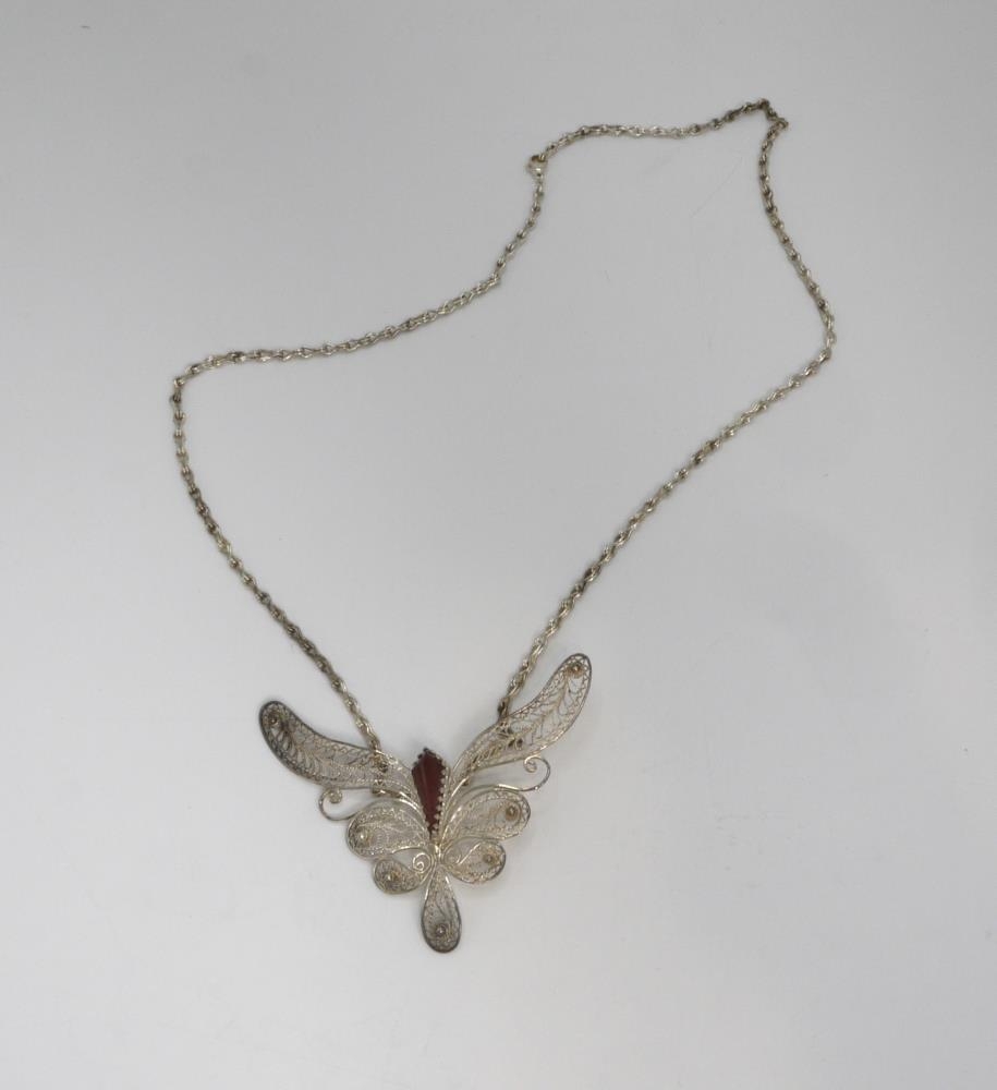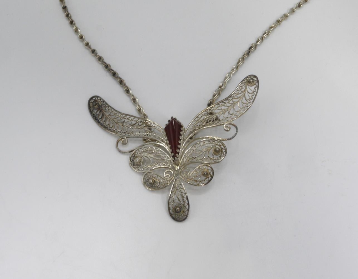 Hálsmen úr silfri, víravirkis fiðrildi með rauðum jaspis í miðju.