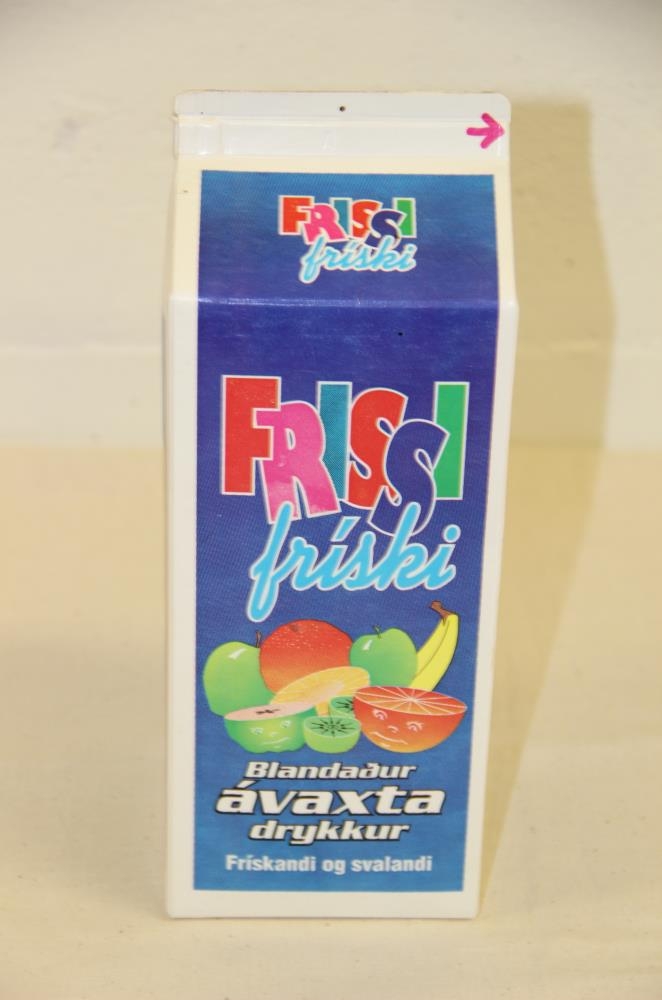 Pappaferna klædd álpappír að innan, undir 2 lítra af ávaxtadrykk. Áprentun í mörgum litum; grunnlitur blár. Þrjár hliðar: Frissi fríski. Blandaður ávaxtadrykkur. Teiknuð mynd af nokkrum ávaxtategundum. Framleiðandi fernu: Elopak, Norge.