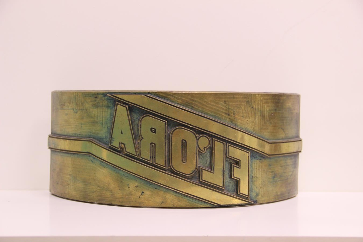 Bogadregið prentmyndamót (klisja) úr kopar. Upphleypt letur: Flóra. Til auglýsinga/kynninga fyrir Efnagerðina Flóru.